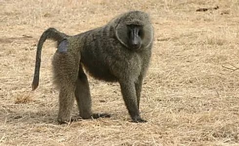 Baboons vary in size and weight depending on the species. The smallest, the Kinda Baboon, is 50 cm (20 in) in length and weighs only 14 kg (31 lb), while the largest, the chacma baboon, is up to 120 cm (47 in) in length and weighs 40 kg (88 lb). All baboons have long, dog-like muzzles, heavy, powerful jaws with sharp canine teeth, close-set eyes, thick fur except on their muzzles, short tails, and nerveless, hairless pads of skin on their protruding buttocks called ischial callosities that provide for sitting comfort. Male hamadryas baboons have large white manes. Baboons exhibit sexual dimorphism in size, colour and/or canine teeth development.