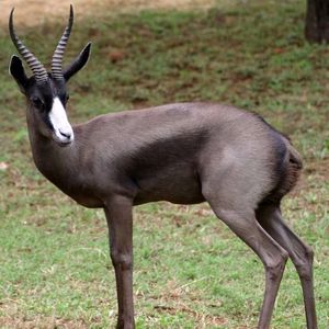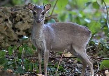 The blue duiker is a small antelope found in western, southern and eastern Africa. It is the smallest duiker. The blue duiker reaches 32–41 centimetres (13–16 in) at the shoulder and weighs 3.5–9 kilograms (7.7–19.8 lb). Sexually dimorphic, the females are slightly larger than the males. The dark tail measures slightly above 10 centimetres (3.9 in). It has short, spiky horns, around 5 centimetres (2.0 in) long and hidden in hair tufts.