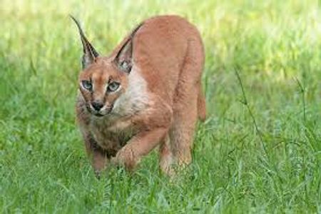 he caracal is a medium-sized wild cat native to Africa, the Middle East, Central Asia and India. It is characterised by a robust build, long legs, a short face, long tufted ears, and long canine teeth. Its coat is uniformly reddish tan or sandy, while the ventral parts are lighter with small reddish markings. It reaches 40–50 cm (16–20 in) at the shoulder and weighs 8–18 kg (18–40 lb).