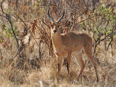 The oribi is a small antelope found in eastern, southern and western Africa. The sole member of its genus The oribi reaches nearly 50–67 centimetres (20–26 in) at the shoulder and weighs 12–22 kilograms (26–49 lb). This antelope features a slightly raised back, and long neck and limbs. The glossy, yellowish to rufous brown coat contrasts with the white chin, throat, underparts and rump. Only males possess horns; the thin, straight horns, 8–18 centimetres (3.1–7.1 in) long, are smooth at the tips and ringed at the base.