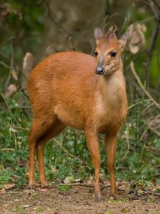 Red forest duikers have a body length of up to 1 m, a typical shoulder height of 43 cm, and an average mass of 14 kg.[Both sexes have short, straight horns about 6 cm long, although in females they may be smaller in size.Towards the base, the horns have coarse rings and longitudinal but they are smooth towards the tips
