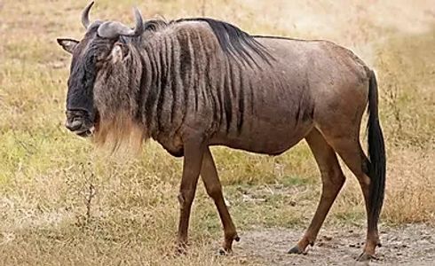 The blue wildebeest is typically 170–240 cm (67–94 in) in head-and-body length. The average height of the species is 115–145 cm (45–57 in).While males weigh up to 290 kg (640 lb), females seldom exceed 260 kg (570 lb). A characteristic feature is the long, black tail, which is around 60–100 cm (24–39 in) in length. All features and markings of this species are bilaterally symmetrical for both sexes. The average life span is 20 years in the wild.