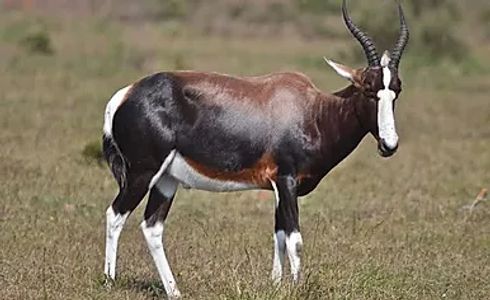 The bontebok is a tall, medium-sized antelope. They typically stand 80 to 100 cm (31 to 39 in) high at the shoulder and measure 120 to 210 cm (47 to 83 in) along the head and body. The tail can range from 30 to 60 cm (12 to 24 in). Body mass can vary from 50 to 155 kg (110 to 342 lb). Males are slightly larger and noticeably heavier than females. The bontebok is a chocolate brown colour, with a white underside and a white stripe from the forehead to the tip of the nose, although there is a brown stripe across the white near the eyes in most blesbok. The bontebok also has a distinctive white patch around its tail.