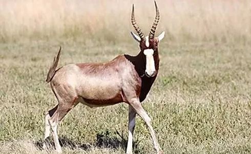 Red hartebeest, it is the most colorful hartebeest, with black markings contrasting against its white abdomen and behind. It has a longer face that other subspecies, with complex curving horns joined at the base. The average weight of a male is about 150 kg, and female is 120 kg. Their average shoulder height is 135 cm, and horns are 60 cm long.