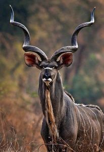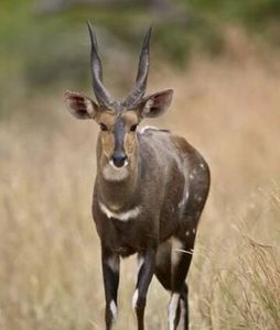 nyala is a spiral-horned antelope native to southern Africa. The body length is 135–195 cm (53–77 in), and it weighs 55–140 kg (121–309 lb). The coat is maroon or rufous brown in females and juveniles, but grows a dark brown or slate grey, often tinged with blue, in adult males. Females and young males have ten or more white stripes on their sides. Only males have horns, 60–83 cm (24–33 in) long and yellow-tipped.